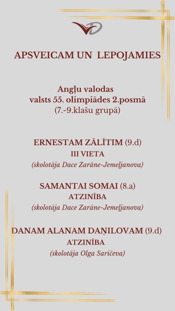 Angļu valodas valsts 55.olimpiādes rezultāti (2.posms) 7.-9.klašu grupā