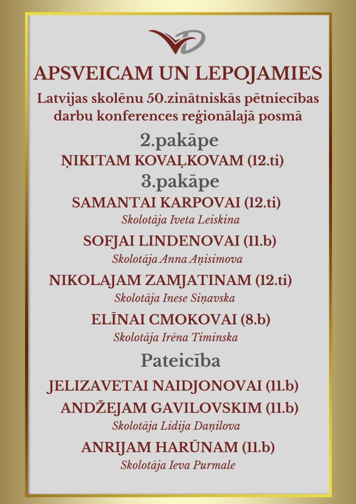 Latvijas skolēnu 50.zinātniskās pētniecības darbu konferences reģionālā posma rezultāti