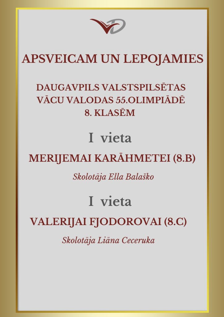Daugavpils valstspilsētas vācu valodas 55.olimpiādes 8.klasēm rezultāti