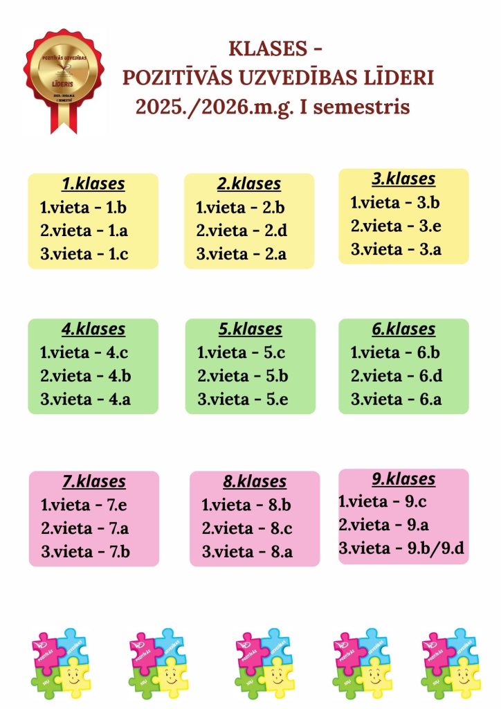 Ar kausiem tika apbalvotas arī katras paralēles klases, kuras mācību pusgada laikā viscentīgāk ievēroja skolas Iekšējās kārtības noteikumus un demonstrēja pozitīvu uzvedību.
