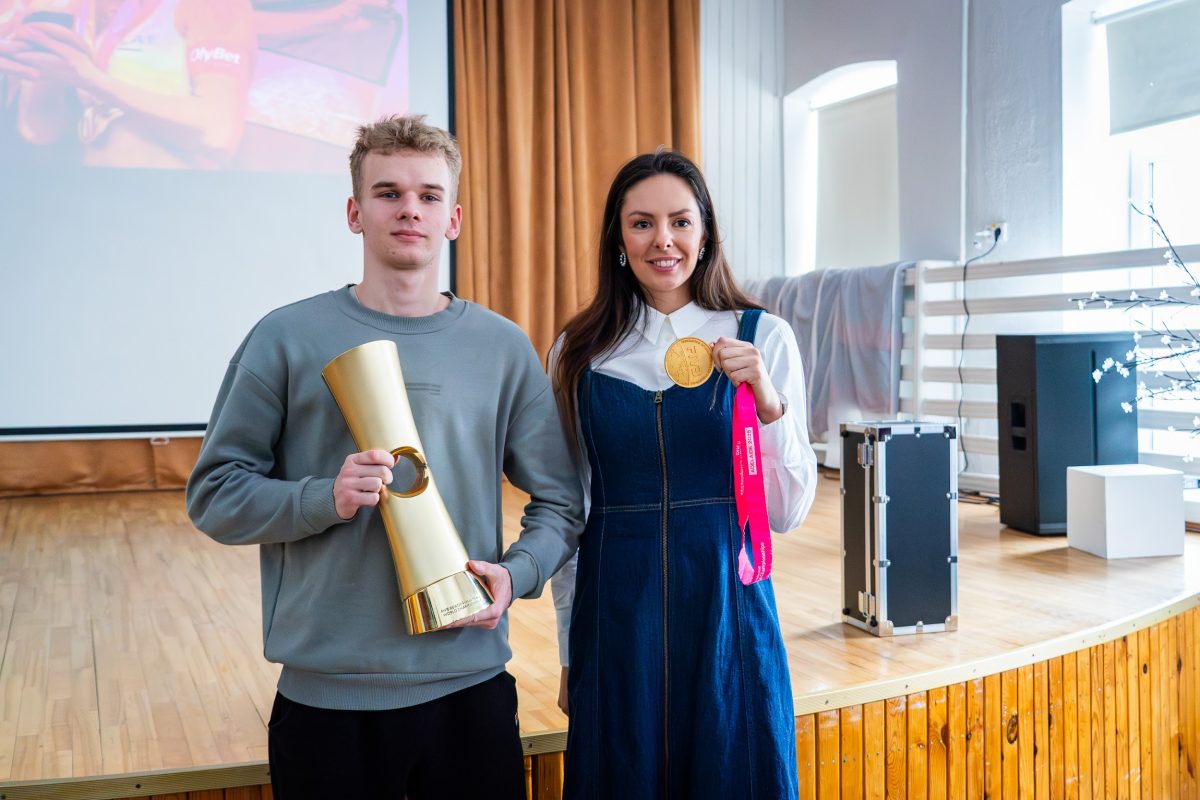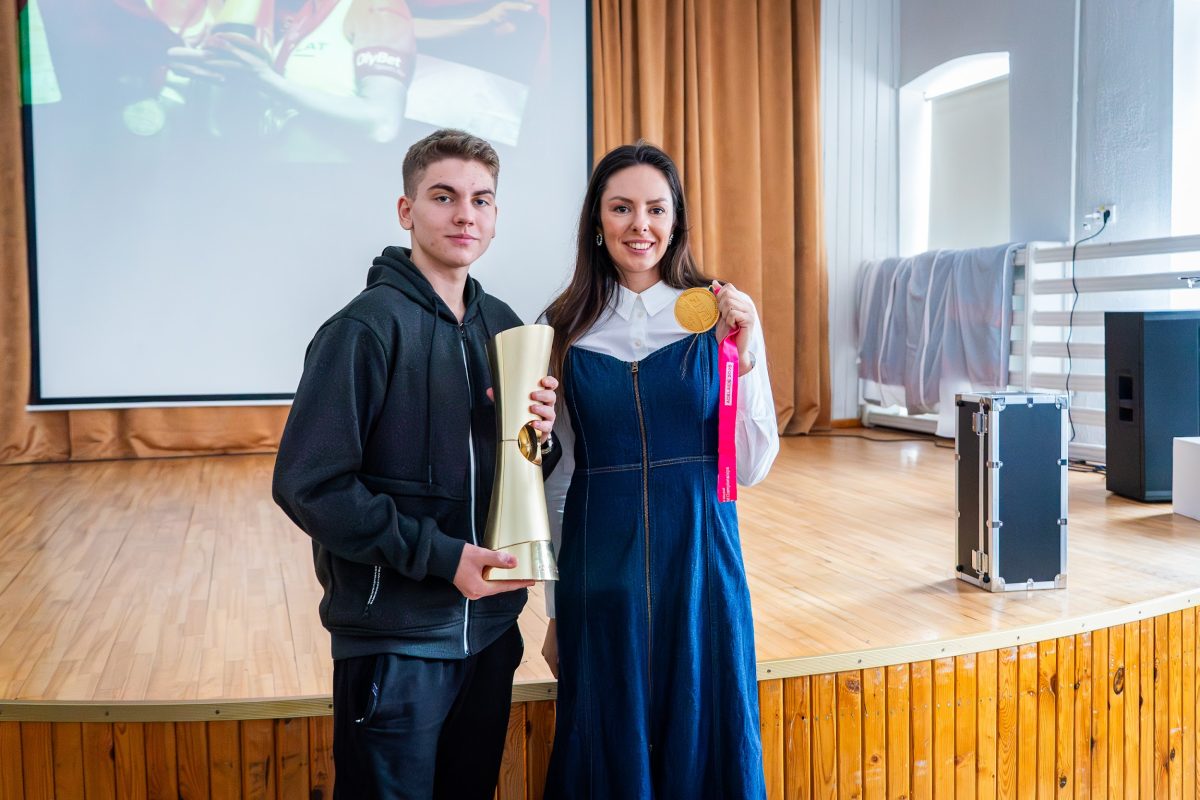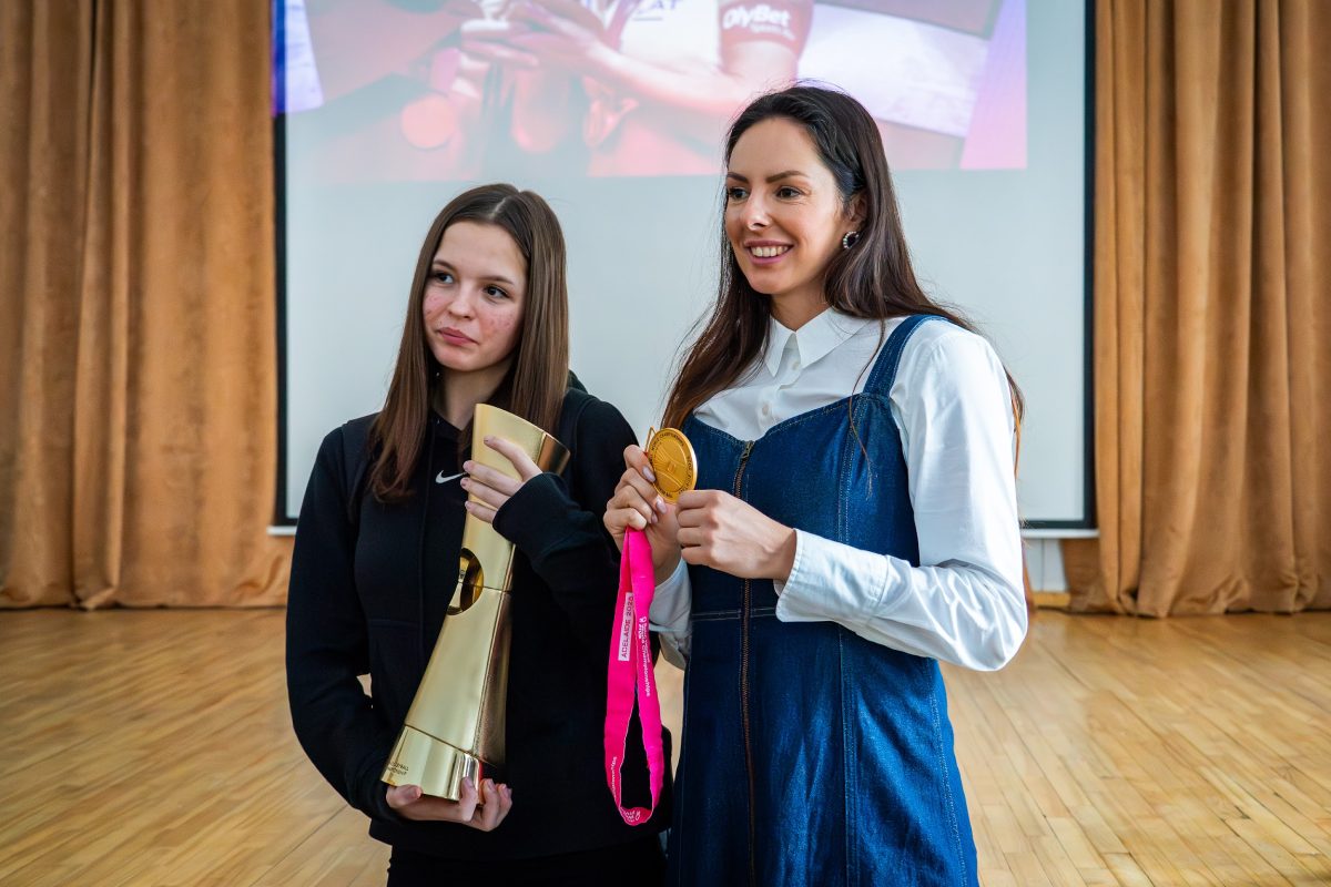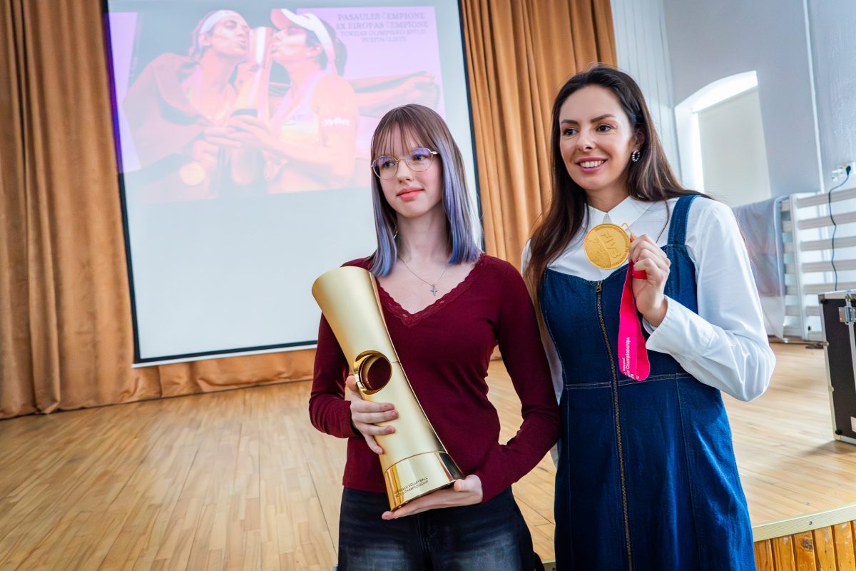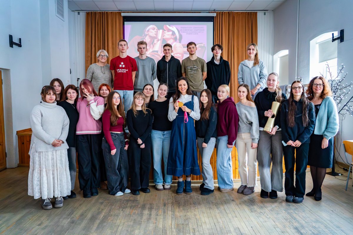 Skolēniem bija iespēja uzdot sportistei jautājumus, paturēt rokā gan zelta medaļu, gan iegūto kausu, kā arī kopā nofotografēties.