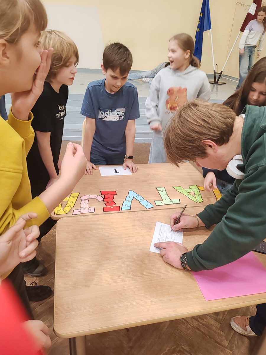 Viena no pirmajām aktivitātēm bija “Saliec puzli”, kurā komandām vajadzēja salikt Latvijas nosaukumu, gan prasmi sadarboties.