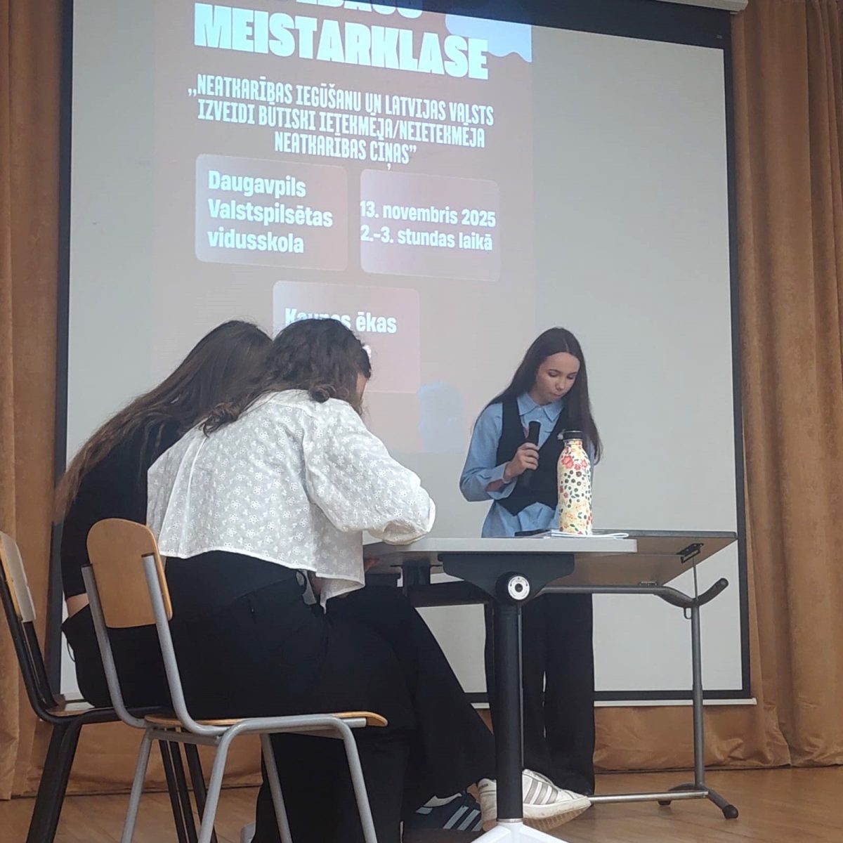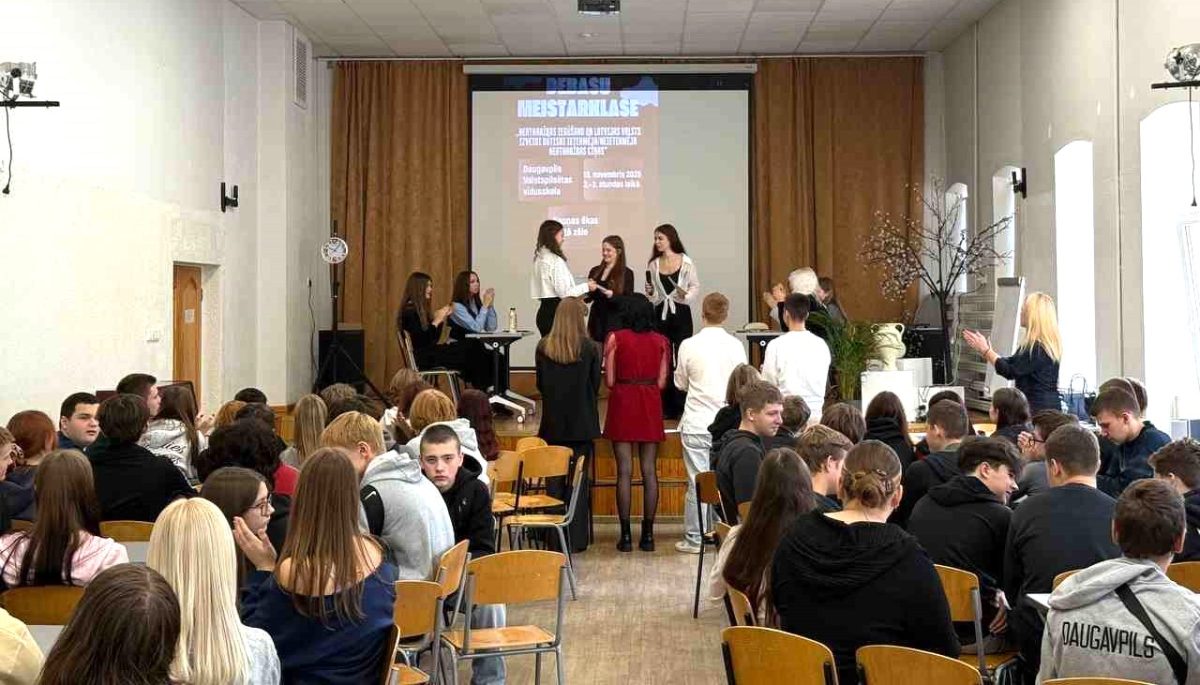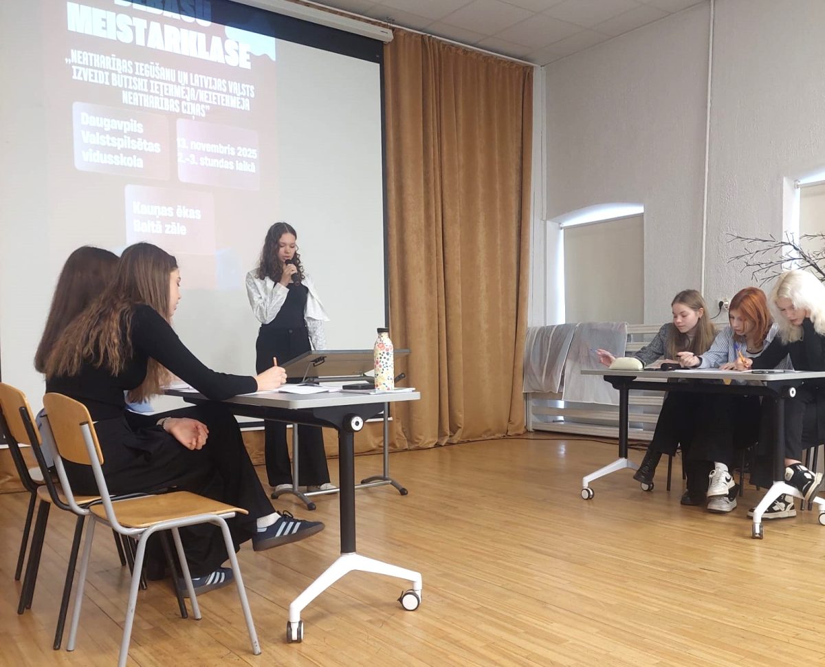 13.novembrī 12.v klases skolnieces Ksenija Samuša, Valērija Vuškāne, Diāna Ananjeva sava projektu darba ietvaros organizēja jauniešu debašu meistarklasi 9. klašu skolēniem par tēmu “Neatkarības iegūšanu un Latvijas valsts izveidi būtiski ietekmēja/ neietekmēja neatkarības cīņas”.