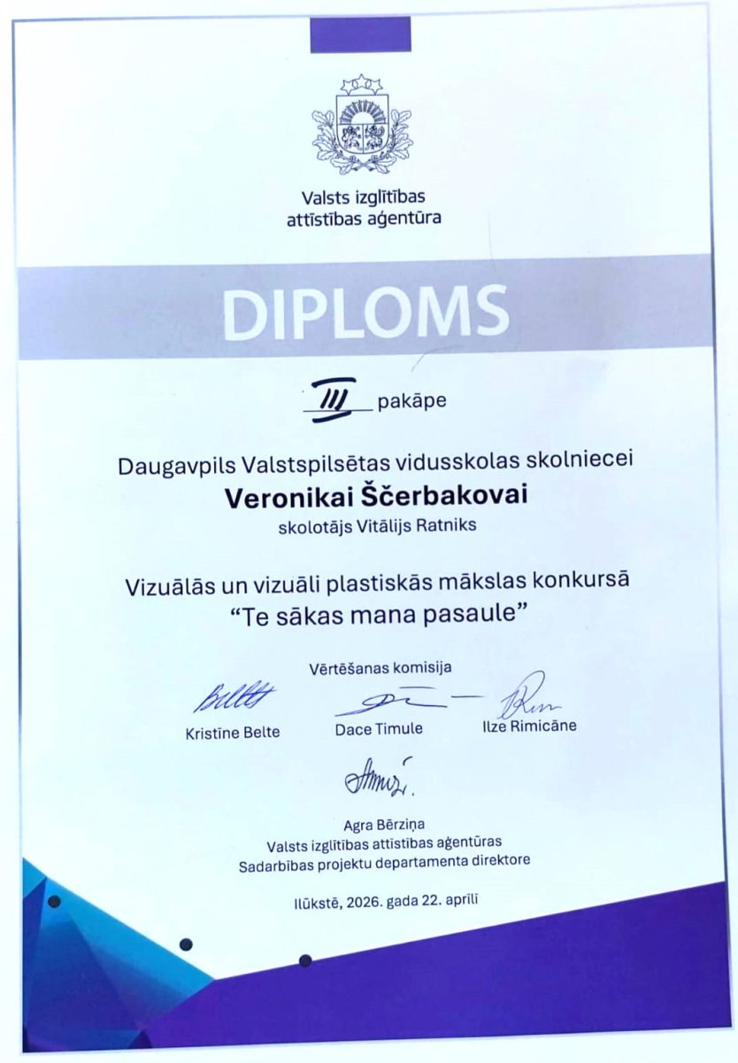 23. aprīlī Ilūkstē, Augšdaugavas novadā, norisinājās Valsts izglītības un attīstības aģentūras organizētā vizuālās un vizuāli plastiskās mākslas konkursa “Te sākas mana pasaule” 2. kārta. Lepojamies, ka sīvā konkurencē mūsu skolas 6.c klases skolniece Veronika Ščerbakova izcīnīja godalgoto 3. vietu!