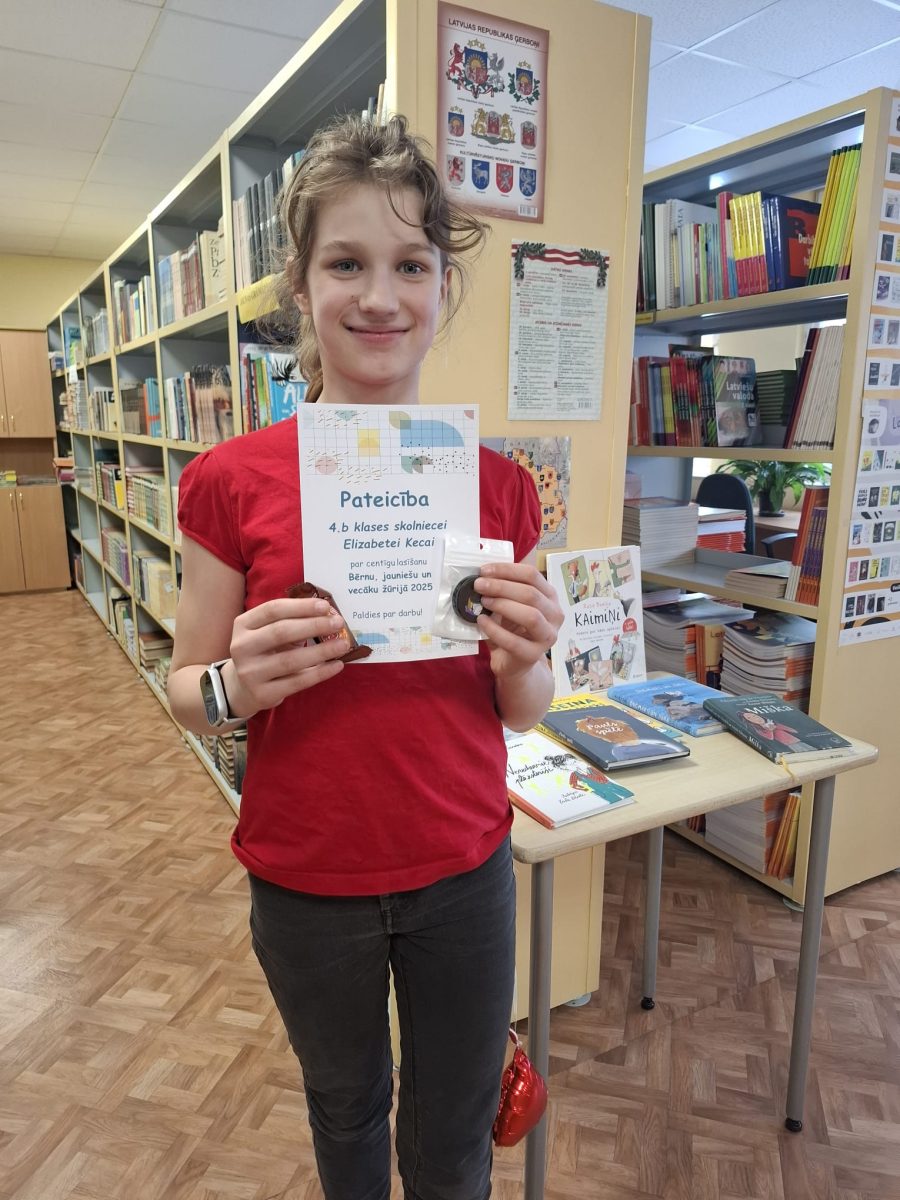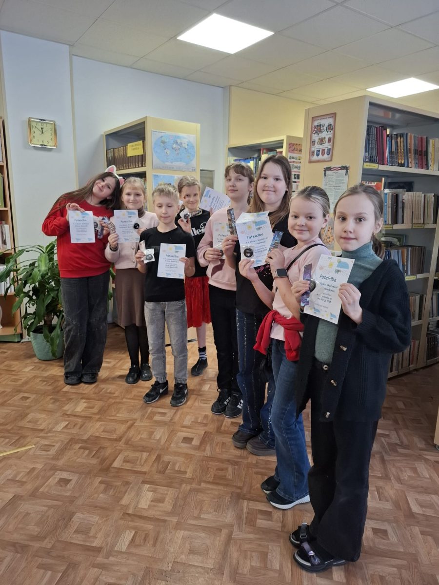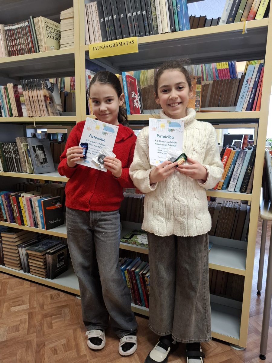 Balsošana par visvairāk iepatikušos grāmatu noslēdzās 15.februārī un līdz 20.februārim tika godināti visi aktīvākie lasītāji, kas godam veica Bērnu žūrijas dalībnieku uzdevumu – lasīja jaunās grāmatas, aizpildīja anketas un balsoja par visinteresantāko grāmatu. Šogad mūsu skolas lasīšanas maratonā piedalījās 65 skolēni un 10 pieaugušie. Visaktīvākie žūrijas lasītāji bija 4.a un 4.c klases skolēni. Skolas bibliotekāre Evita lasīja grāmatas mūsu mazajiem lasītājiem (1.b un 1.d klases skolēniem) un palīdzēja viņiem aizpildīt anketu. Zinām, ka vairāki mūsu skolēni piedalās šajā programmā arī pilsētas bibliotēkās. Visi mūsu grāmatu eksperti saņēma Pateicības un balviņas par čaklo un jēgpilno grāmatu lasīšanu. Apsveicam! Mūsu skolas aktīvākie lasītāji:
