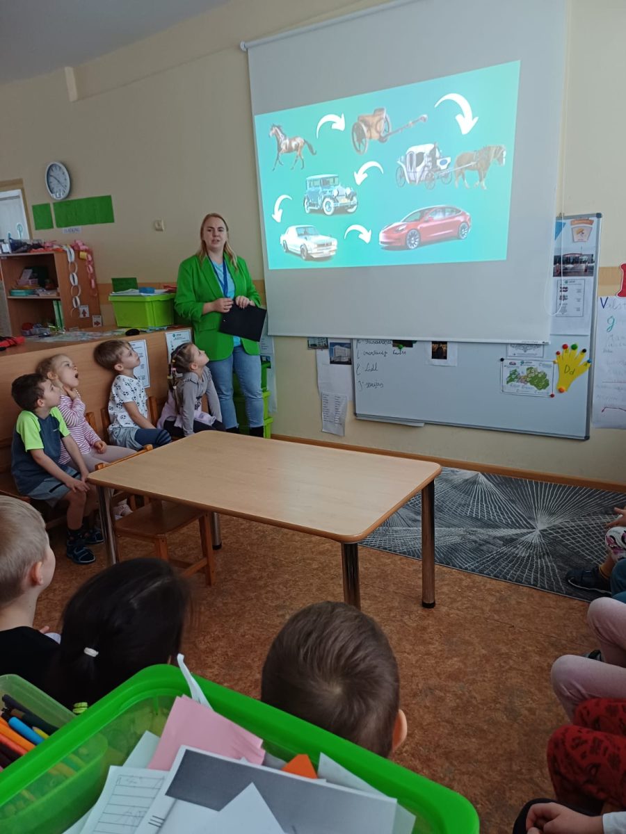 Bērni iepazinās ar transporta attīstības vēsturi, aplūkojot vizuāli bagātu prezentāciju – no zirgu pajūgiem līdz mūsdienu automašīnām un elektromobiļiem. Nodarbības vadītāja skaidroja, kāpēc transportlīdzekļi laika gaitā ir mainījušies un kādas tehnoloģijas tos padara drošākus un efektīvākus.