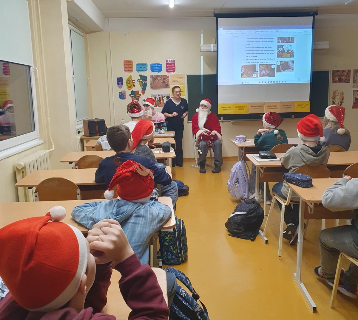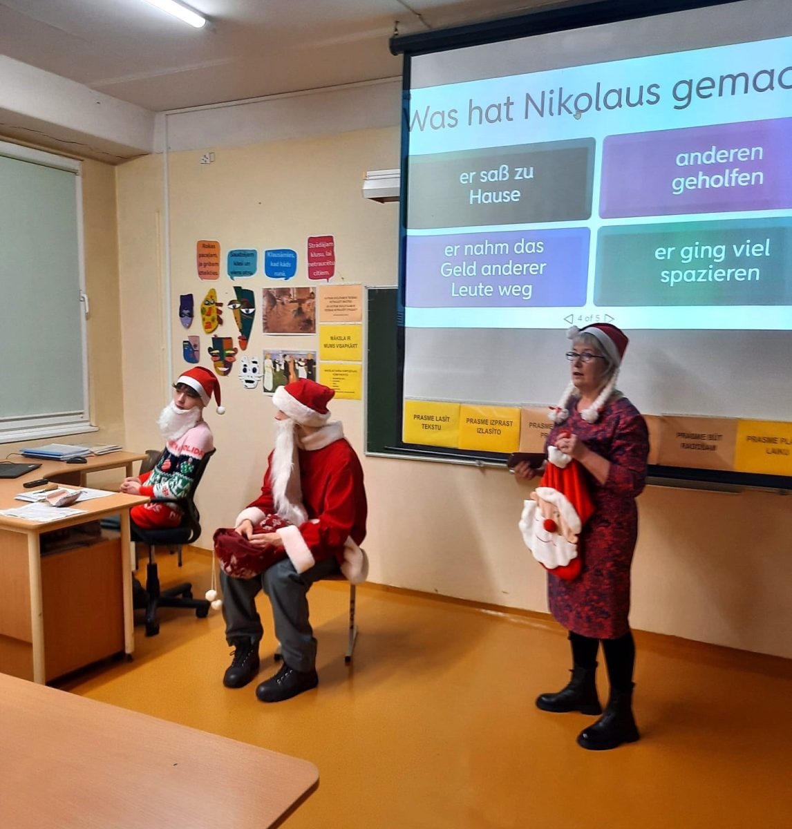 Vidusskolēni bija sagatavojuši gan aizraujošu viktorīnu par Svētā Nikolausa dienas tradīcijām vācu valodā, gan arī mūsdienīgas dziesmas, kas veltītas šai dienai. Skolēni varēja līdzdarboties, dziedot līdzi karaoke versijām, radot priecīgu un rotaļīgu atmosfēru klasēs.