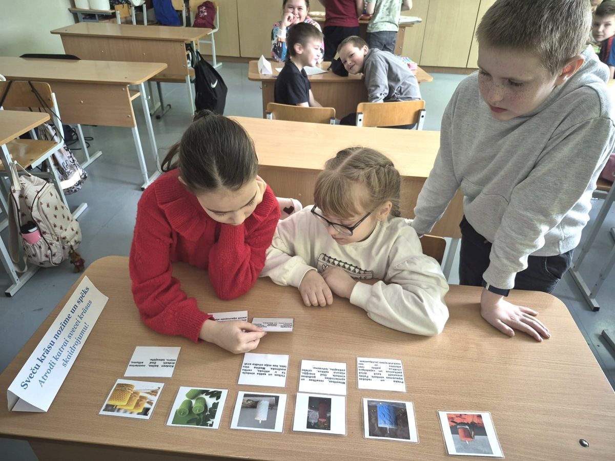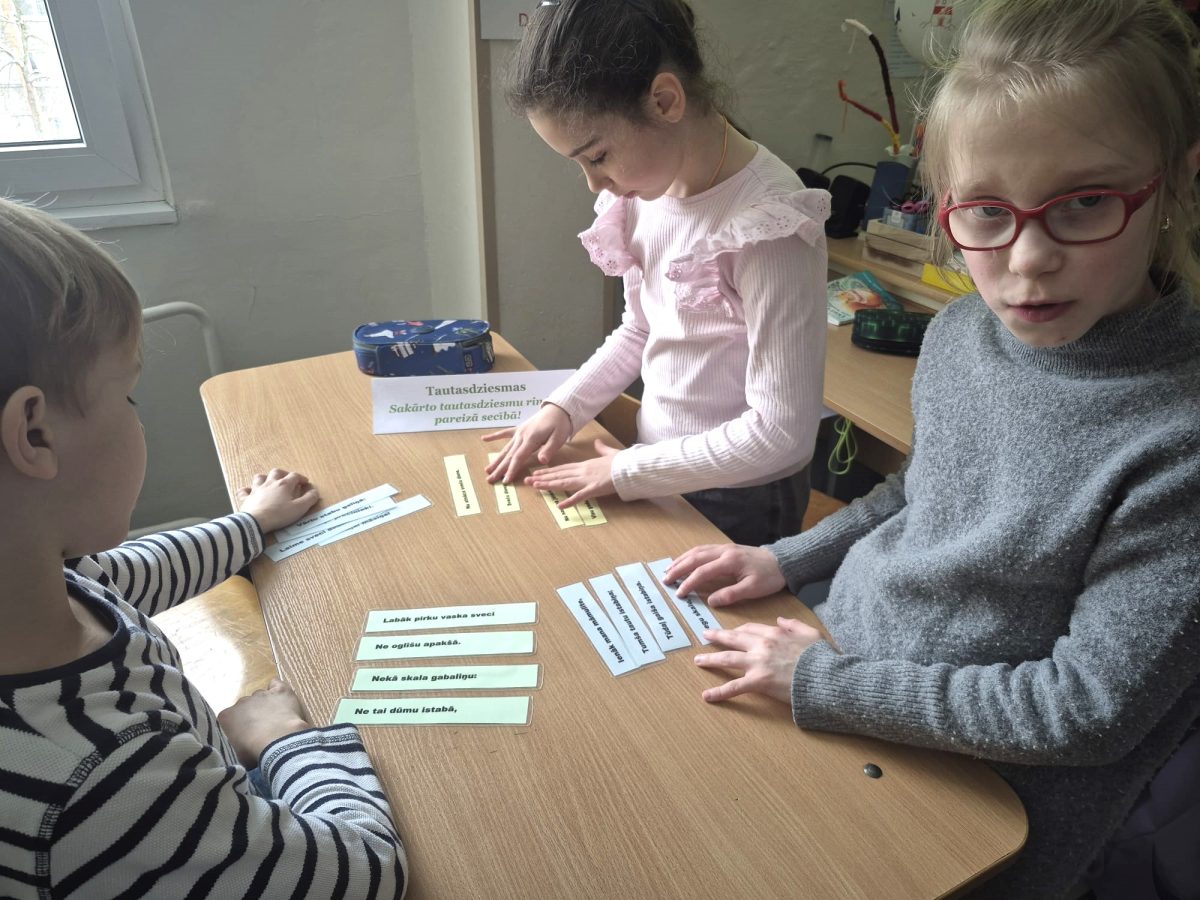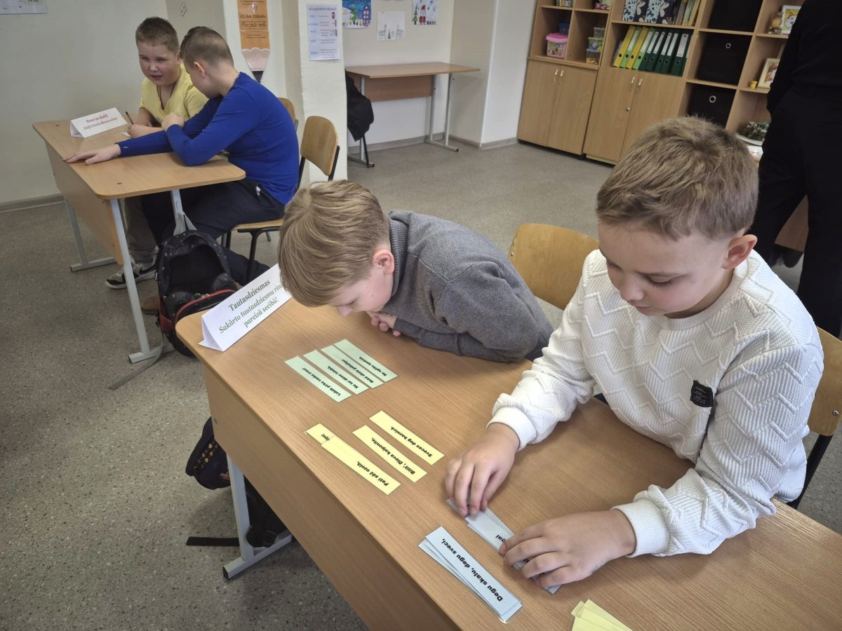 Izglītojamie iepazinās ar latviešu tautasdziesmām par gaismu, sauli un darbu. Viņi pareizā secībā salika tautasdziesmu rindiņas, meklēja atslēgvārdus un pārrunāja tautas gudrības nozīmi mūsdienās.