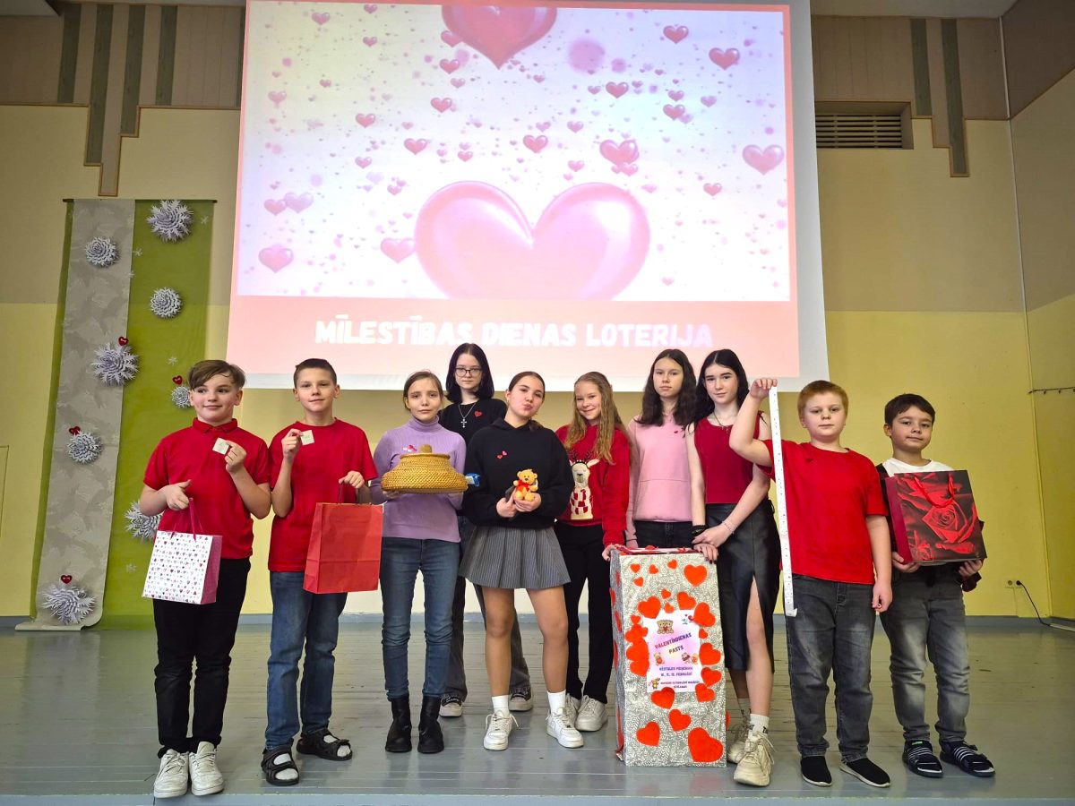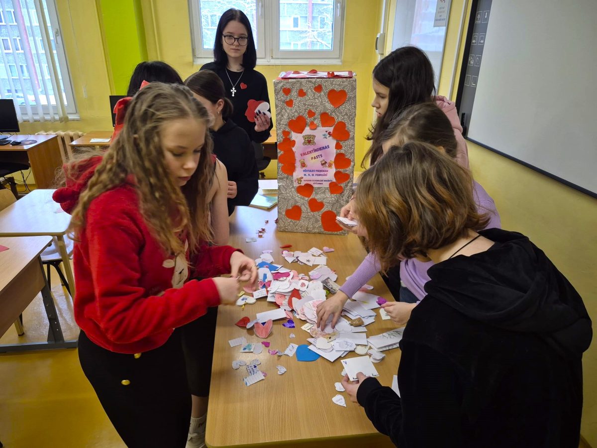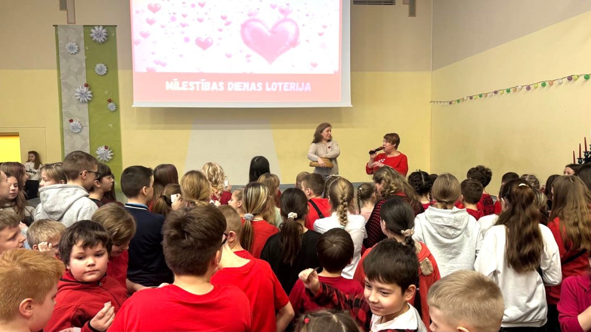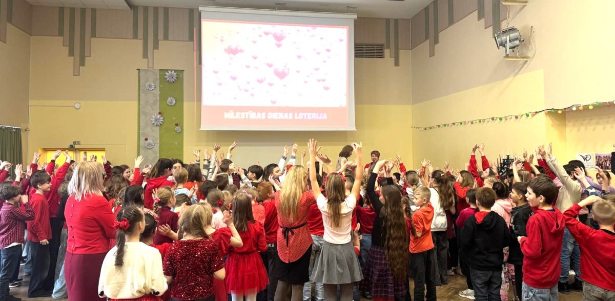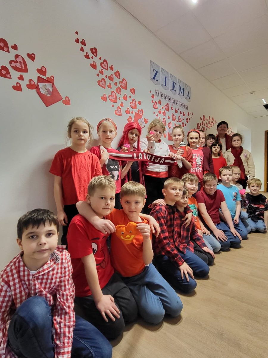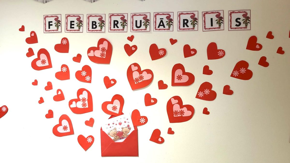 13.februārī mūsu skolā pie sākumskolas un pamatskolas skolēniem valdīja īpaši sirsnīga un priecīga gaisotne – svinējām Valentīna dienu! Jau no paša rīta Jelgavas ielas un Tautas ielas ēkās gaiteņus piepildīja priecīgas sejas un sarkanas krāsas akcenti skolēnu un skolotāju apģērbā. Sarkanais tonis šajā dienā simbolizēja mīlestību, draudzību un vienotību.